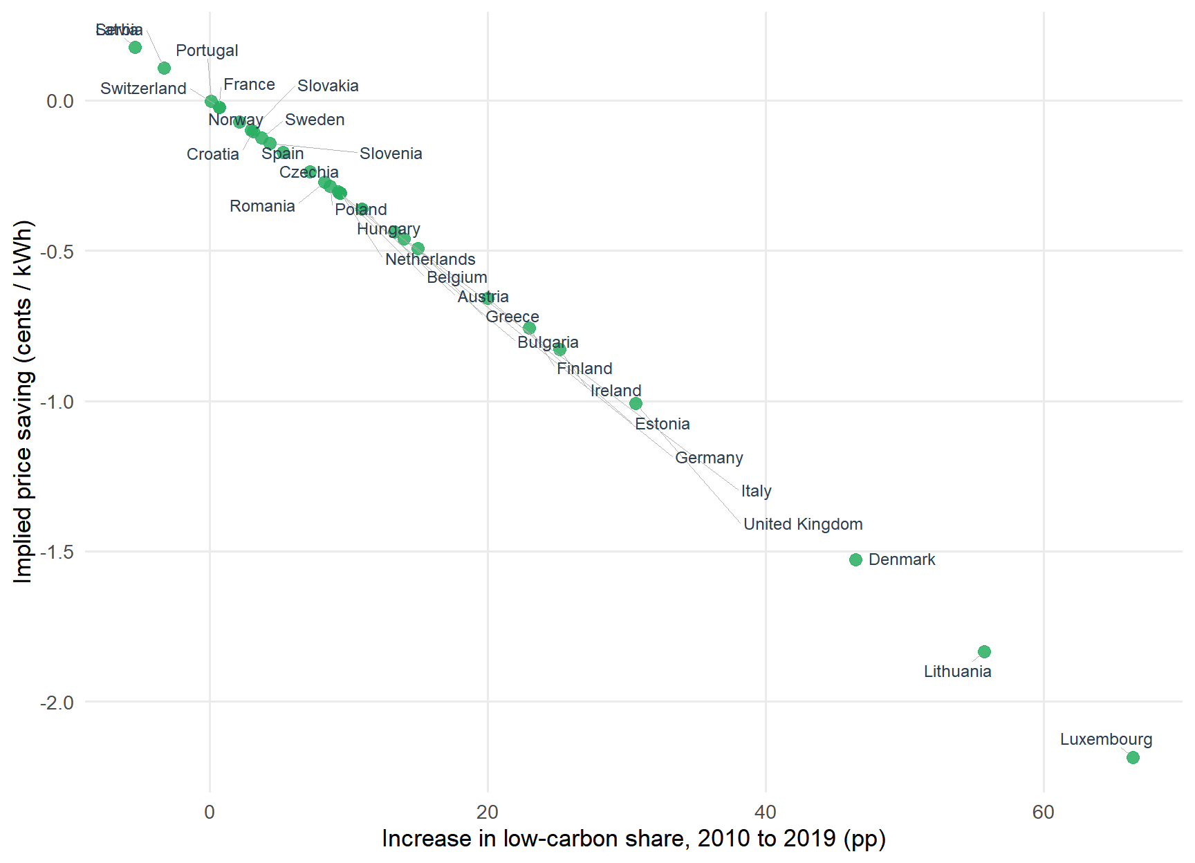 This analysis uses publicly available data to quantify the relationship between a country’s pre-crisis low-carbon electricity share and the size of its price increase.